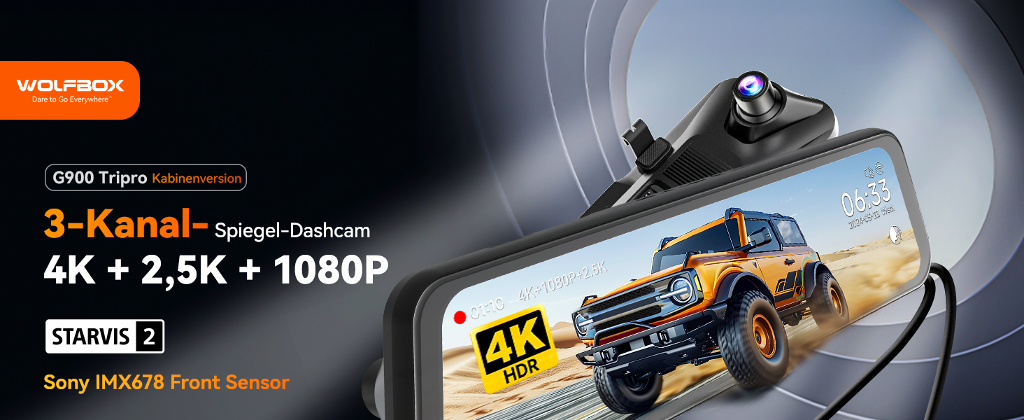 WOLFBOX G900TriPro 4K+2.5K+1080P 3 Channel Cabin Parking Monitor Mirror Dash Cam