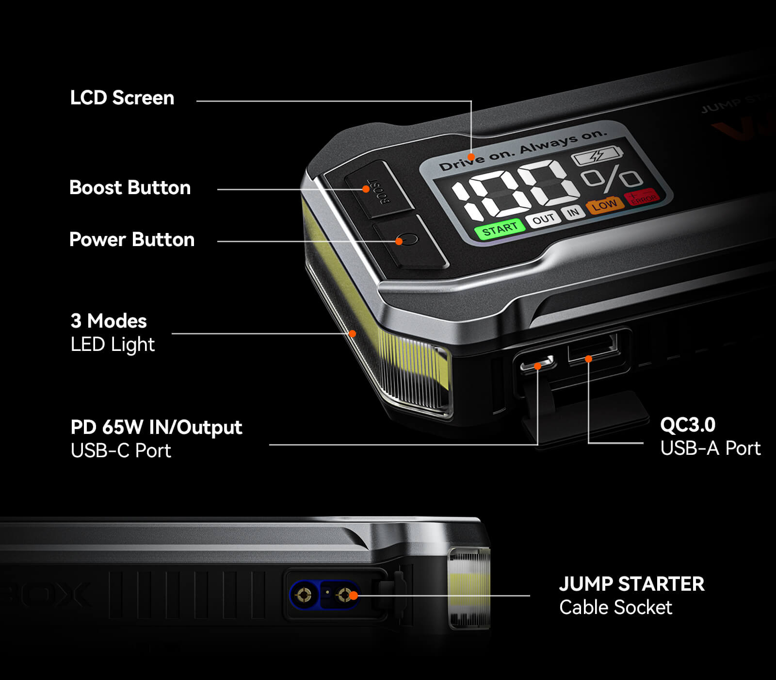 Our jump starter tackles emergencies with three lighting modes: steady, strobe, and SOS, for visibility, alerts, and signals when you need them most.
