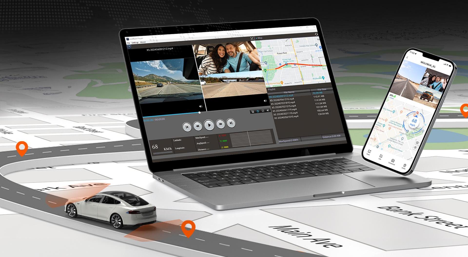 - Rapid 5.8GHz Wi-Fi & GPS TrackingQuickly upload videos and track your vehicle’s location using 5.8GHz Wi-Fi and built-in GPS. Manage footage effortlessly through the “WOLFBOX” app.