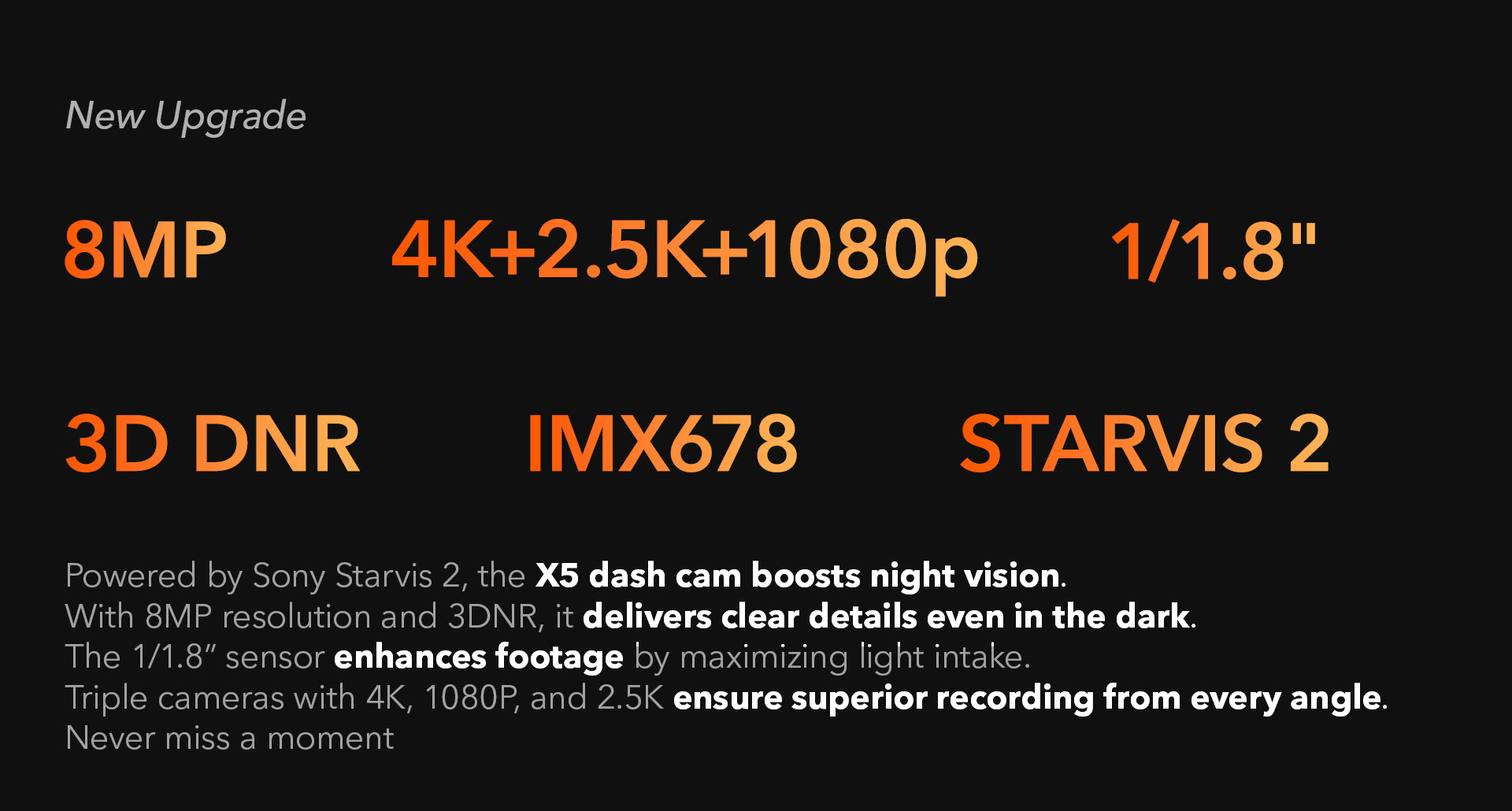 - Advanced SONY STARVIS 2 SensorThe X5 uses the SONY STARVIS 2 IMX678 sensor for superior image quality and color reproduction. Capture detailed footage in any lighting condition.